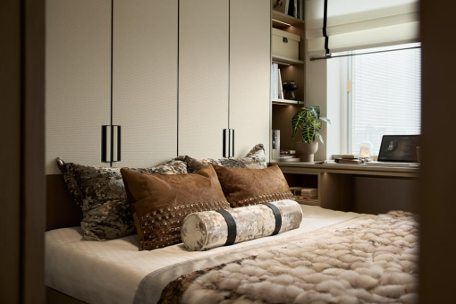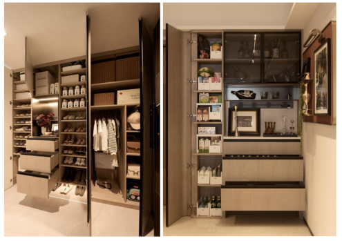 针对原项目户型狭小、功能滞后核心痛点,中国电建地产设计团队以“空间价值最大化”为原则进行创新设计。在48平方米样板间中,通过可变式功能布局实现客厅与卧室模式自由切换,极大提升了小户型空间适应性(如图2);全屋收纳系统基于人体工学分层分区,玄关柜顶层存放行李箱、中层挂放外套、底部设置常穿鞋位,15度斜角鞋柜提升了30%收纳量(如图3、图4)。在空间利用上,原本房子结构单一,缺乏空间流动性。中国电建地产设计团队通过改善结构,将70平方米样板间儿童房打造为双层空间,创造了上下分区的男孩房和女孩房,让每个人都拥有通透且私人的空间(如图5),让“小户型,大空间”成为现实。