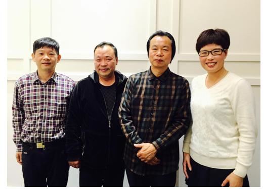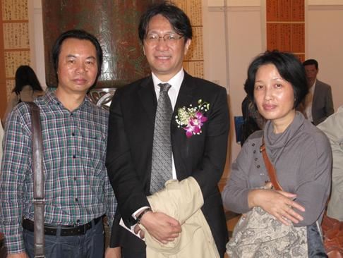 林邦德(左一)及夫人、中国书协会员潘芳华(右一)与中国文联副主席、中国书协副主席、西泠印社副社长兼秘书长陈振濂(中)在"十届国展"现场合影