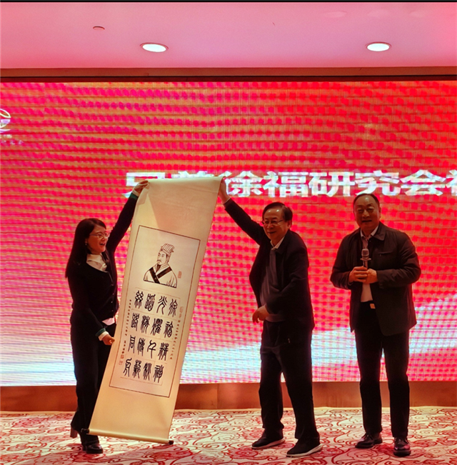 青岛琅琊暨徐福研究会副会长隋连国特别向慈溪研究会赠送了书法作品“徐福精神,光耀千秋,蹈海传薪,丝路同舟”,表达了各地徐福研究机构同心传承、携手弘扬的共同心愿。