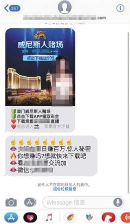 但防不胜防,iMessage的垃圾信息甚至是违法内容不断侵蚀着苹果用户的手机。诸多用户向记者反映,他们收到的iMessage垃圾短信包含赌场、博彩广告,开发票广告、色情影片推荐、贷款、刷单、贩卖高仿A货、药物等内容。这些垃圾短信以图片或者文字的形式不断发到用户手机上,“删了又来,根本删不尽”,有用户称“很是头疼。”