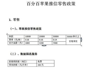 记者找到其中两家平台咨询报价情况,其中一家发来的报价单显示:群发一万条的价格是0.18元/条,两万条0.16元/条,五万条0.14元/条,五万条以上价格需要详谈。该平台同时提供数据筛选服务,价格为每一万条300元,比如只发送给女性用户。