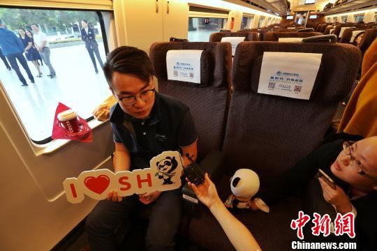 乘务员与乘客互动,宣传进口博览会主题。 张亨伟 摄