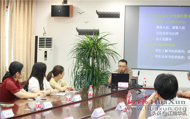 各位书法专家与荆川小学的老师们一起进行了座谈会,曹月红校长与许龑副校长分别介绍了荆川小学的学校文化与墨香校园的打造过程。随后,张冰博士进行了专题讲座,介绍了书法在当代社会的文化意义,以及社会文化格局中对基础书法教育的若干思考。