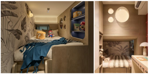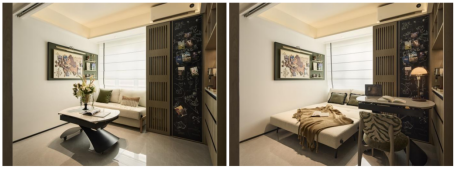 针对原项目户型狭小、功能滞后核心痛点,中国电建地产设计团队以“空间价值最大化”为原则进行创新设计。在48平方米样板间中,通过可变式功能布局实现客厅与卧室模式自由切换,极大提升了小户型空间适应性(如图2);全屋收纳系统基于人体工学分层分区,玄关柜顶层存放行李箱、中层挂放外套、底部设置常穿鞋位,15度斜角鞋柜提升了30%收纳量(如图3、图4)。在空间利用上,原本房子结构单一,缺乏空间流动性。中国电建地产设计团队通过改善结构,将70平方米样板间儿童房打造为双层空间,创造了上下分区的男孩房和女孩房,让每个人都拥有通透且私人的空间(如图5),让“小户型,大空间”成为现实。