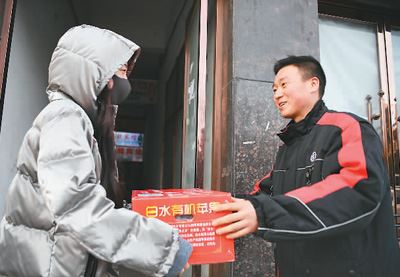 春节期间,负责西安城北某人员密集小区派送工作的快递小哥罗飞龙(右)将快递送至客户手中。