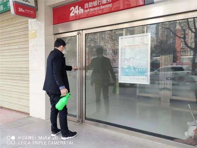 为给办理业务的客户和员工营造安全健康的卫生环境,疫情发生以来,该行所有营业网点每天进行消毒处理,营业前重点对网点叫号机、自助机具、柜面和厅堂等区域,门把手、机器按钮、密码键盘、操作屏幕等部位进行酒精擦拭。