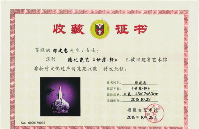 2018年10月,作品《甘露-净》被福建省艺术馆非物质文化遗产博览苑正式收藏。