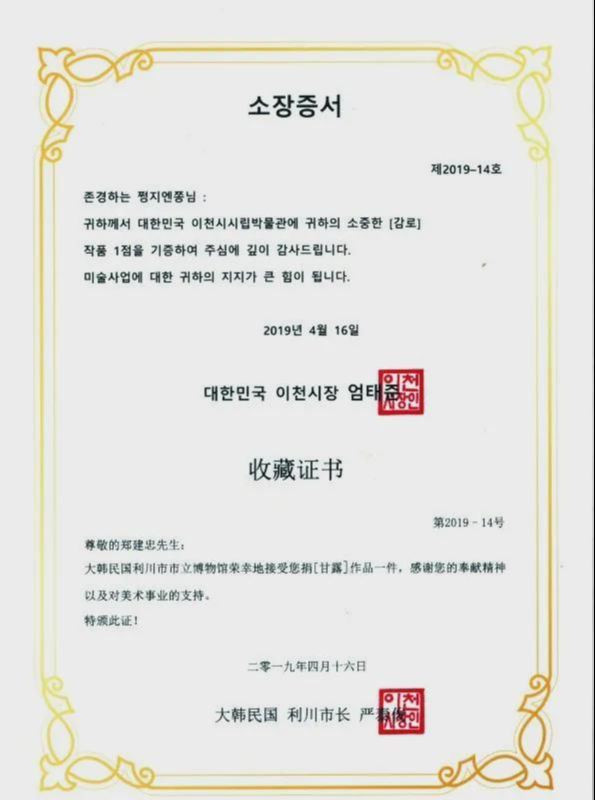 2019年4月,作品《甘露》被韩国大韩民国利川博物馆正式收藏。