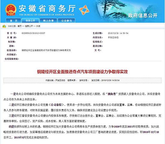 12月26日,安徽省商务厅发布信息显示,奇点汽车承诺将总部迁入铜陵,将安徽奇点作为未来发展的中心,将“独角兽资质”装入安徽奇点公司,并将安徽奇点公司作为未来上市的主体——此举被业内解读为奇点汽车在寻求铜陵政府在资金等方面的帮助——而相应的代价,则是铜陵经开区将向奇点派驻董事、监事,并委派财务人员参与财务管理,对财务实施监管,奇点汽车“主权”是否完整,成了业内新的担忧。