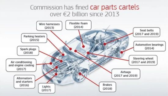 欧盟表示,目前已对参与非法联合的汽车零部件供应商处以20亿欧元(约合22.6亿美元)的罚款。美国司法部去年5月也表示,美国在过去几年进行的一项类似的反垄断调查中,已对46家供应商(其中多数是日本供应商)以及32名高管处以了29亿美元以上的罚款。