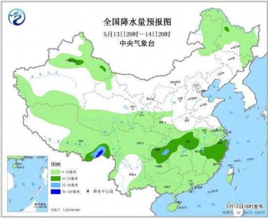 图1 全国降水量预报图(5月13日20时-14日20时)