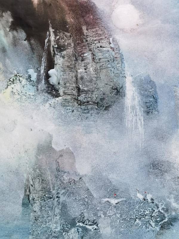 何谓水姿彩画?此乃中国上海画家张嵩平独创的画种。在中国画的特殊宣纸上及其他卡纸上用现代的丙烯颜料等进行涂绘渲染,并施以刮、皴、擦、掠、拓等技法,将传统的山水画画法进行了颠覆性实验。用西画的元素有机地融入绘画之中,大大地将所绘的山水突出立体和层次。尤其使瀑布和溪流水的描绘更具动感和身临其境之感。还巧妙地应用水彩画技法将所描绘的山水画晶莹剔透,画面显湿润鲜艳的感觉。同时,又将摄影光学应用于绘画之中,让所绘画面既朦胧又真实感,那潺潺流水和青苔岩石以及翩翩起舞的丹顶鹤,在画面中栩栩如生呼之欲出。俨然像一帧摄影作品。另外,还将古老的木刻版画的托法也应用其中。综合各种画法结合绘画者对大自然的特殊感受,创作出独具匠心的水姿彩画。