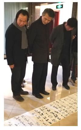 中国书协副主席刘洪彪(左二)在点评林邦德(左一)的草书长卷