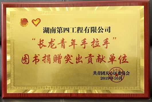 本报讯(记者 唐云飞 通讯员 熊亮)11月13日,长沙市天心区团委为湖南建工集团四公司送来 “‘长龙青年手拉手’图书捐赠突出贡献单位”奖牌,以此奖励湖南建工集团四公司在龙山县捐赠图书活动中的突出表现。