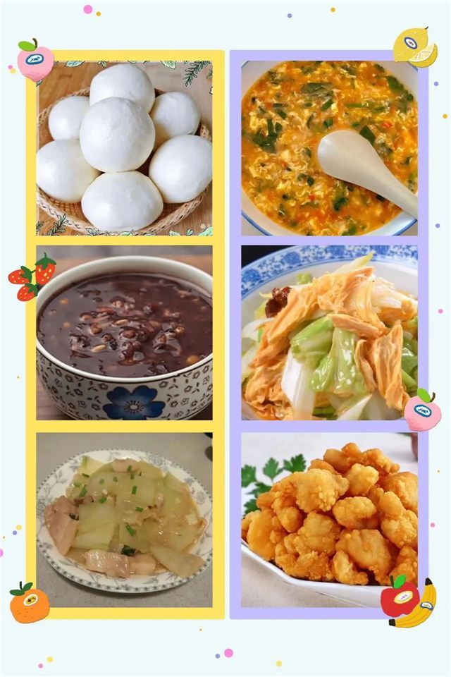 - 营养 健康 美味 安全 - 中小学生处于儿童及青少年时期,身体正处于生长发育旺盛阶段,对各种膳食营养的需求与日俱增,为此,我校食堂针对不同学段的孩子,为他们定制了不同的营养健康食谱。大厨们根据时节的变化,挑选当季新鲜的食材,做到营养均衡搭配,让孩子们吃得健康,吃得放心。 星期一食谱 营养早餐 圆白菜炒肉片、醋溜土豆丝 小米粥、鸡蛋/烧卖 大盘鸡、西红柿炒鸡蛋、香菇油菜 大米/炒猫耳朵、橘子 雪花鸡柳、杏鲍菇肉片、糖醋藕 小米粥/调和饭、馒头 星期二食谱 营养早餐 黄豆芽烧肉、西葫芦香干 玉米糁、火腿/鸡蛋、馒头 炖牛肉、鱼香肉丝、蒜泥菠菜 米饭、丸子汤/水果粥、哈密瓜 有机花菜炒肉片、百叶包肉 大白菜豆泡、小米粥/挂面汤、馒头 星期三食谱 营养早餐 香芹肉片、醋溜土豆丝、燕麦粥 奶黄包子/鸡蛋、馒头 红烧肉炖土豆、西红柿炒鸡蛋、耗油生菜 大米/面、汤圆汤/鸡蛋汤、圣女果 萝卜炖肉、宫保鸡丁、烩菜 玉米糁/面片汤、馒头 星期四食谱 营养早餐 榨菜肉丝、红萝卜炒绿豆芽 豆浆、油条/鸡蛋、馒头 炸酱面、小米炒饭 丸子酥肉汤/银耳汤、苹果汤 杏鲍菇肉片、鸡柳、红烧茄子 小米粥/调和饭、馒头 星期五食谱 营养早餐 大白菜肉片、醋溜土豆丝 汉堡/鸡蛋、馒头、小米粥 糖醋排骨、麻婆豆腐、香菇油菜 米饭、汤圆汤/鸡蛋汤、哈密瓜 养胃晚餐 宫保鸡丁、小合菜、芹菜素鸡 小葱卷/馒头、小米粥 星期六食谱 营养早餐 西葫芦肉片、青椒绿豆芽 牛奶燕麦粥、肉包子/鸡蛋、馒头 红烧鸭块、烧三鲜、包菜粉丝 大米/面、红枣汤/丸子汤、沙糖桔 养胃晚餐 盐酥鸡、冬瓜肉片、白菜腐竹 黑米粥、拌汤、馒头 星期日食谱 香辣土豆丝、圆白菜炒肉片、小米粥 芝麻球/鸡蛋、馒头 红烧鸡腿、西红柿炒鸡蛋、莴笋香干 大米/面、紫菜汤/红枣姜汤、沙糖桔 养胃晚餐 山西回锅肉、百叶包肉、豆芽粉丝 挂面汤/玉米糁粥、馒头 日食不过三餐 家常美味、也是生活百味 唯有爱和美食不可辜负 这些属于双语的味道 “食”刻相伴,好好吃饭 以上膳食配图部分来自网络,具体以实物为准 编辑 | 曹思思 初审 | 闫丽华 终审 | 刘建宏