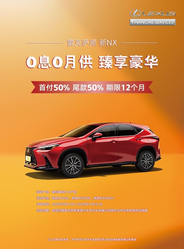 金秋十月,车市消费热潮持续攀升,国庆期间各地大型车展人头攒动。或许您在车展上已对某款高端车型一见倾心,却又在预算面前仍有犹豫,怕首付压力大、怕月供影响生活、怕资金周转不开……现在,好消息来了!丰田汽车金融携手雷克萨斯,特别推出面向雷克萨斯NX、ES等热门车型的0息及低息金融方案,以灵活的金融支持,全方位适配不同消费需求,助您轻松将心仪座驾开回家。