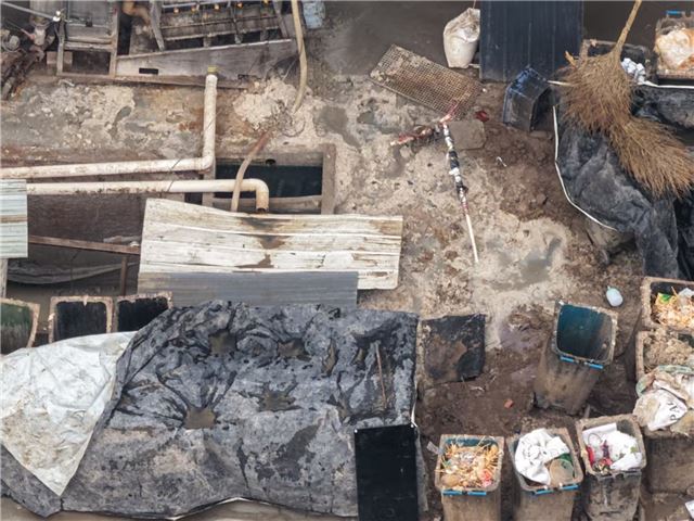 现场观察可见,厂区入口旁设有餐消污染物处理模块等设备,但有明显迹象显示存在污泥排放和污水外溢情况,加剧了当地生态恶化的风险。据当地群众透露,该项目迁入现址不久,部分污水处理设施看似安装,但实际并未正常运行。